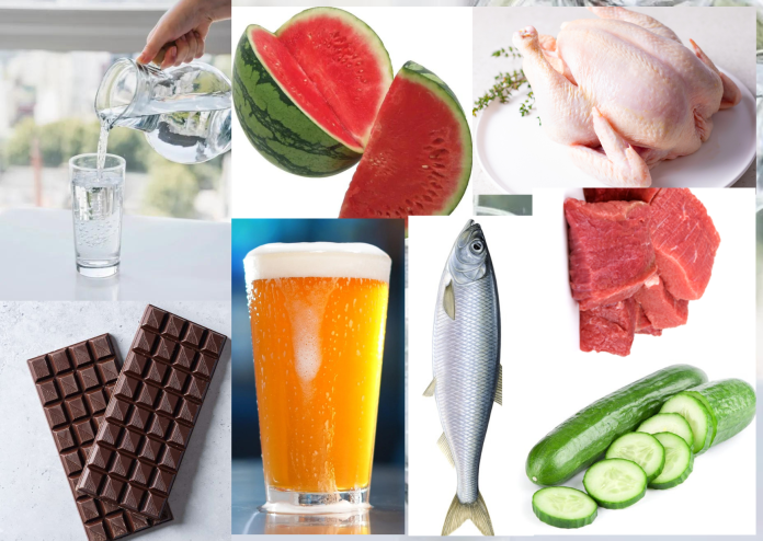 ibyo biribwa ni ibi bikurikira: amazi, imbuto (by’umwihariko watermelon na concombre), imboga z’amababi y’icyatsi kibisi (leafy Green vegetables- by’umwihariko épinard na chou fleur), tangawizi.