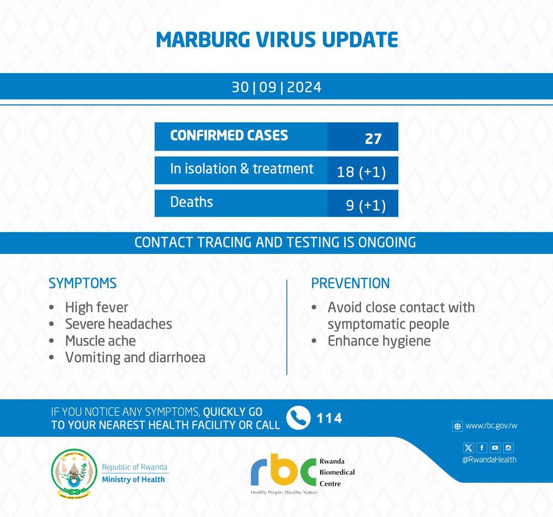 Home English Rwanda: 9 people confirmed dead from Marburg Virus Disease English Rwanda: 9 people confirmed dead from Marburg Virus Disease By PhibaNews Editor - September 30, 2024 72 0 According to the figures from the ministry of health in Rwanda, as of today 30 September 2024, nine people have died so far from Marburg Virus Disease (MVD) while other 18 people are in isolation and on treatment. RELATED ARTICLESMORE FROM AUTHOR English Civil society organisations commit to joining efforts to raise awareness about the new health-related laws English Gasabo: Youth Volunteers Commit to campaigning for new health-related Laws English Gasabo: Youth Call for Increased HIV/AIDS Awareness Campaigns LEAVE A REPLY Cancel reply Please enter your comment! Please enter your name here You have entered an incorrect email address! Please enter your email address here Save my name, email, and website in this browser for the next time I comment. Recent Posts Rwanda: Amakuru mashya kuri Marburg – Abantu 10 bamaze gupfa abandi 19 barikuvurwa PhibaNews Editor - October 1, 2024 0 Rwanda – Marburg updates: 11 people confirmed dead, 7 new confirmed cases PhibaNews Editor - October 3, 2024 0 MINISANTE itanze ibisobanuro ku ndwara bivugwa ko iri guhitana abantu mu Rwanda PhibaNews Editor - September 27, 2024 0 Gasabo: Youth Volunteers Commit to campaigning for new health-related Laws PhibaNews Editor - February 26, 2026 0 Usanzwe ukoreshwa mu kuvura Covid-19: Menya Remdesivir, umuti ugiye guhabwa u Rwanda ngo uvure... PhibaNews Editor - October 4, 2024 0