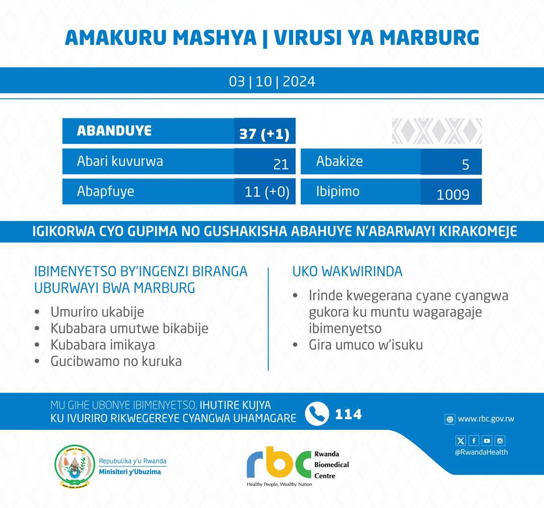 Imibare mishya ya Minisiteri y’Ubuzima mu Rwanda, yatangaje mu ijoro ryo ku wa Kane tariki 03 Ukwakira 2024, yagaragaje ko abantu batanu bakize Marburg ndetse ko nta muntu n’umwe wahitanwe n’iki cyorezo. Mu bapimwe kandi, umuntu umwe ni we basanzemo virusi ya Marburg