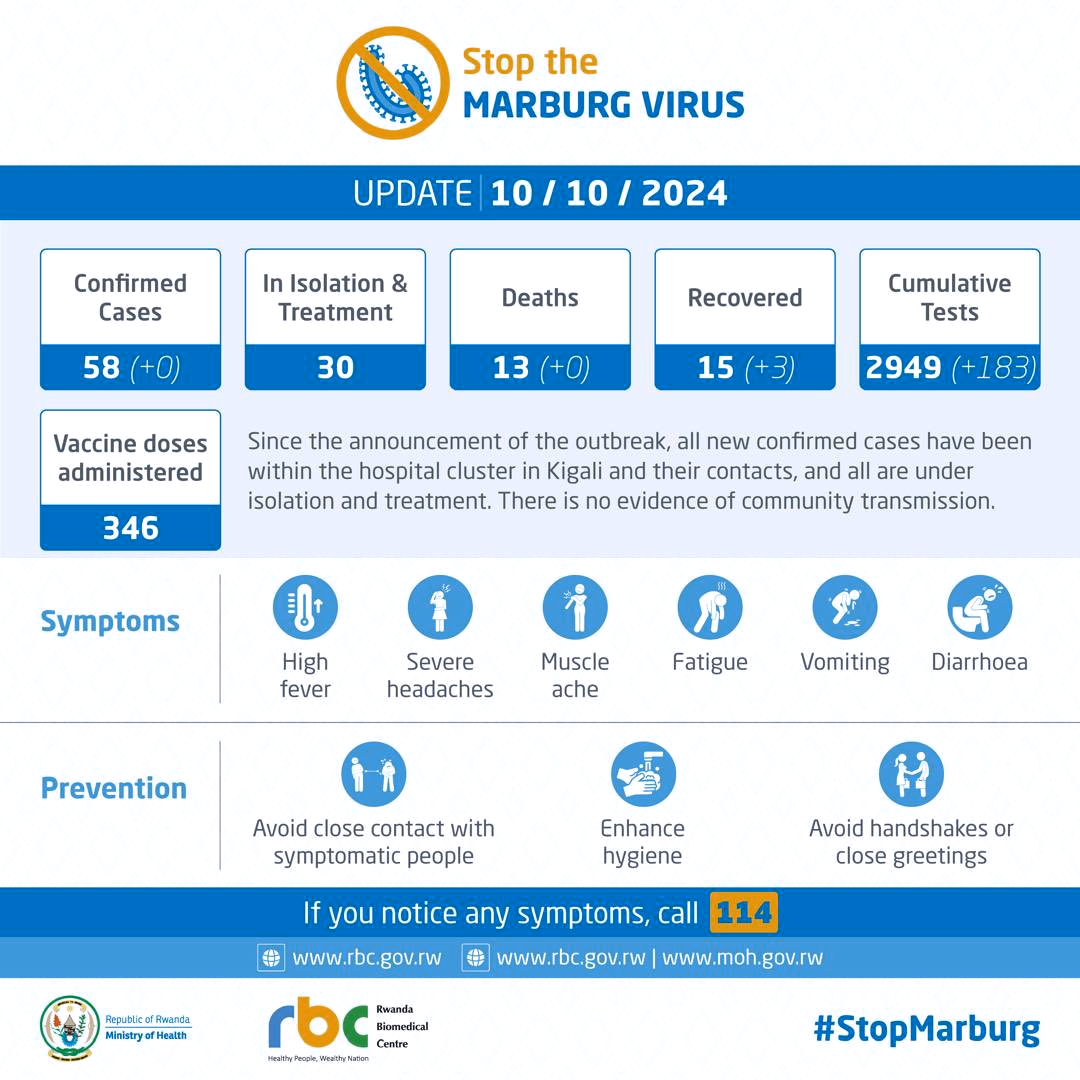 In its daily updates on the status of the Marburg outbreak in Rwanda, the latest report, from the evening of Thursday, October 10, 2024, states that, “Since the announcement of the outbreak, all new confirmed cases have been within the hospital cluster in Kigali and their contacts, and all are under isolation and treatment. There is no evidence of community transmission.”